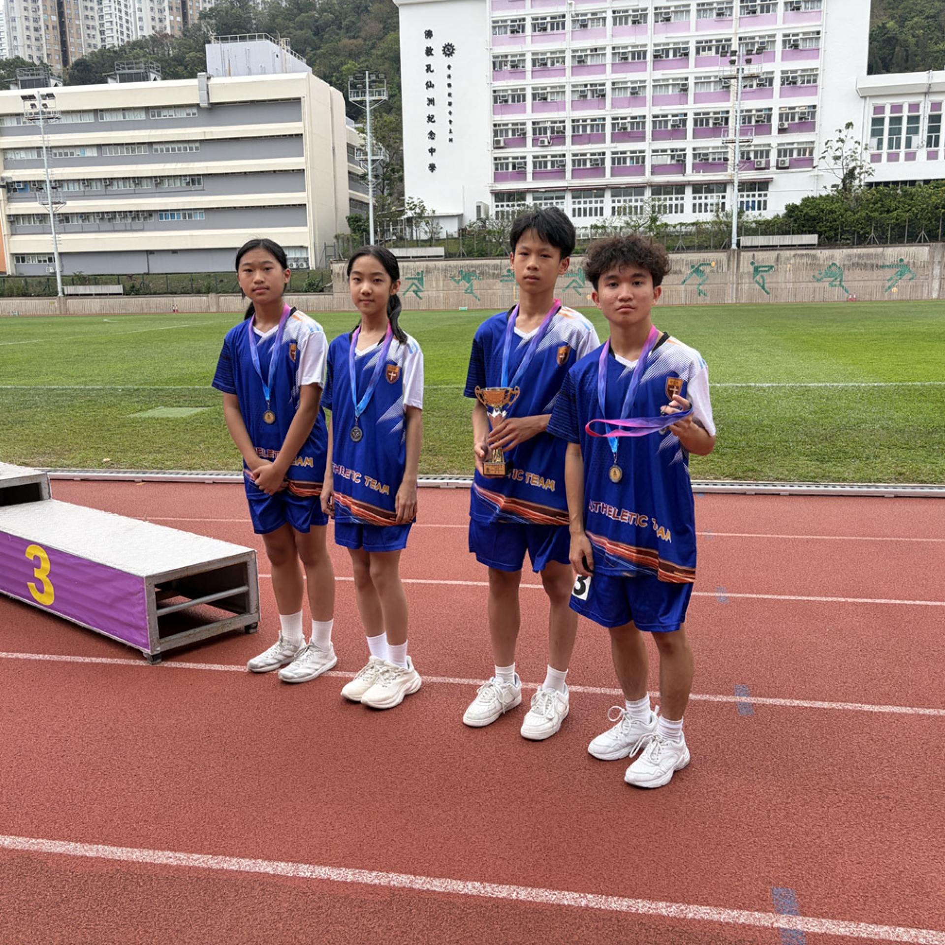 6A Zhou Jun'an, 6A Zeng Yayou, 5B Chen Sihua, and 5B Lin Jingyang represented their school at the St. Kung Hui Kowloon Bay Kei Lok Primary School Alumni Relay Tournament on March 31st. They teamed up to win fourth place in the 4x100m mixed relay, demonstrating excellent teamwork and fighting spirit, bringing glory to their school!