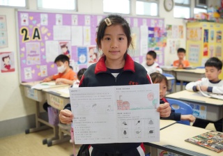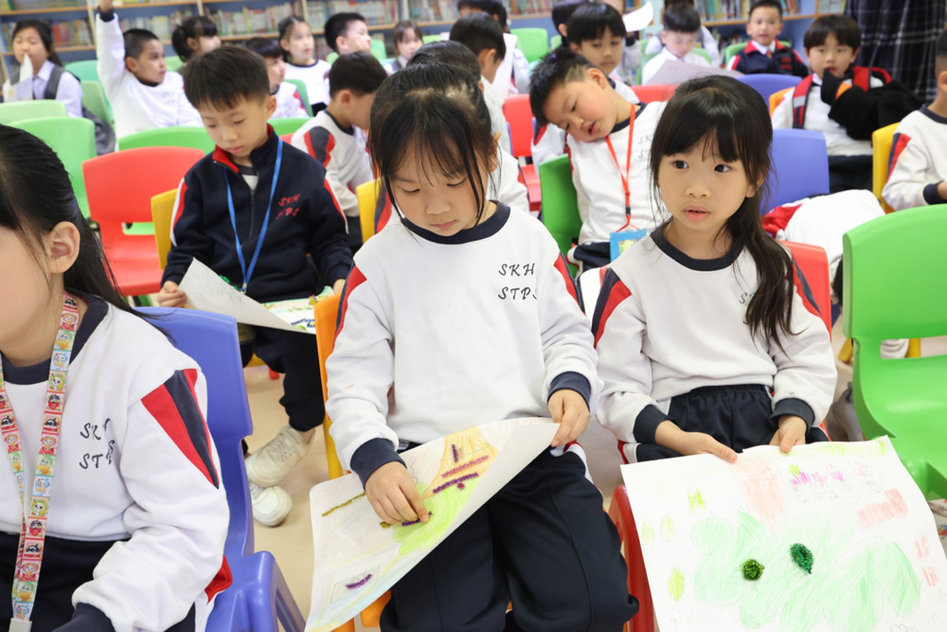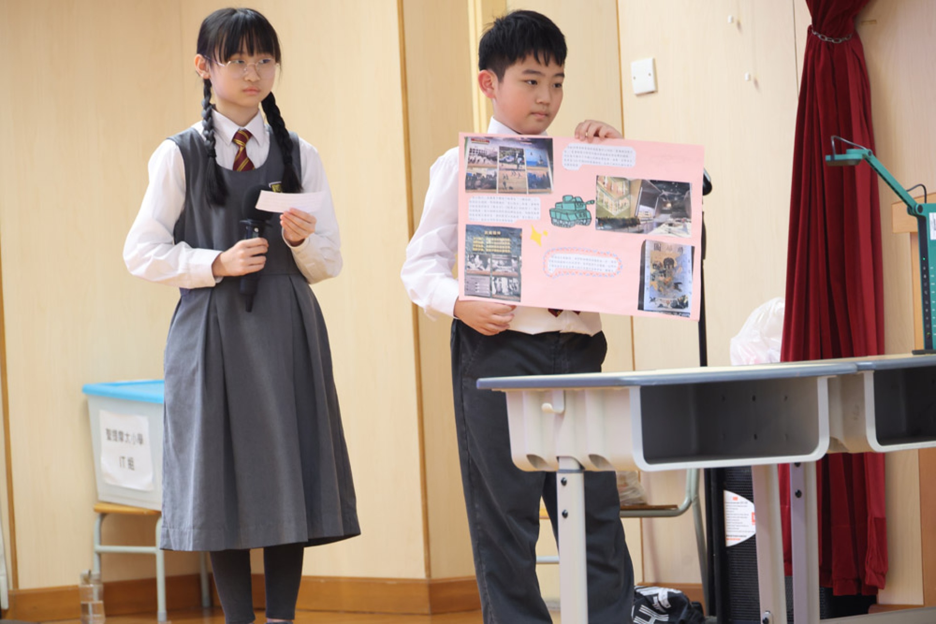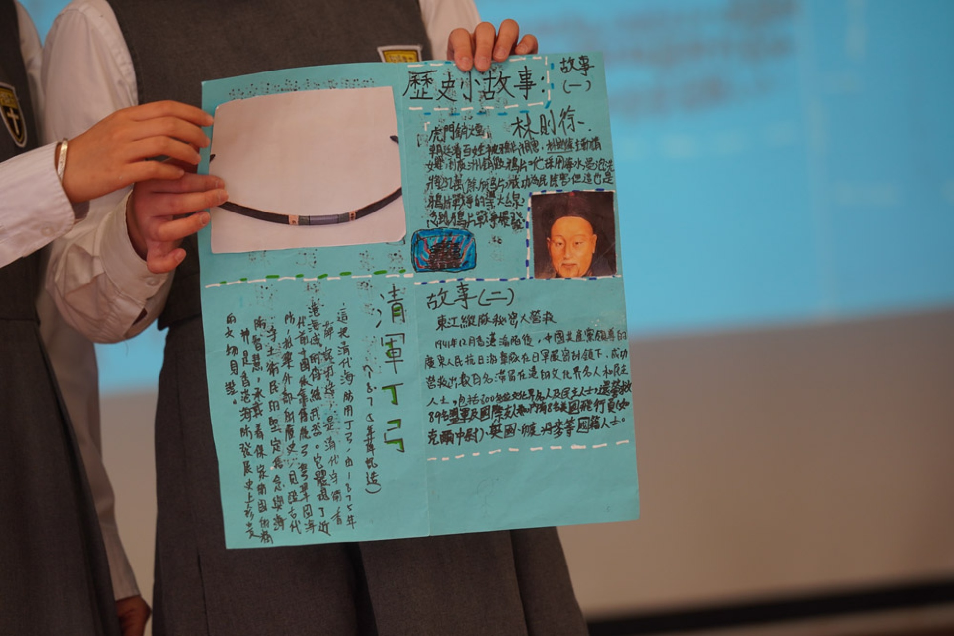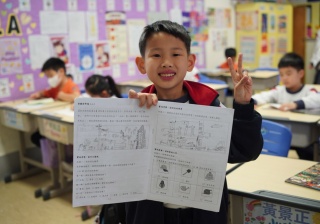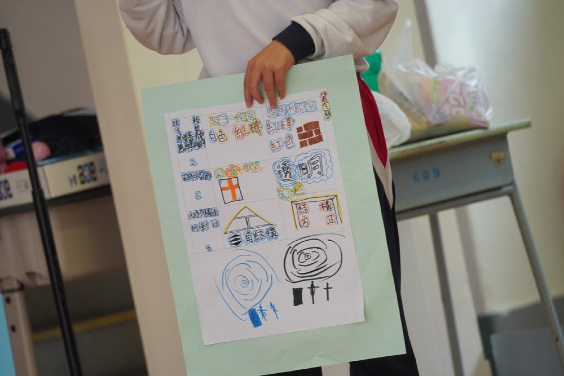 • 展示學生親手繪製的報告板及學習單;